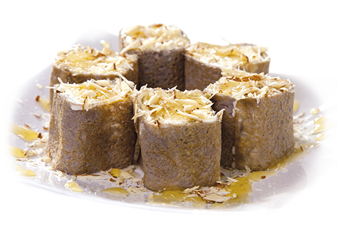 Банан, сливочный крем, мёд, блинчик шоколадный, миндаль. Энергетическая ценность: 416 ккал