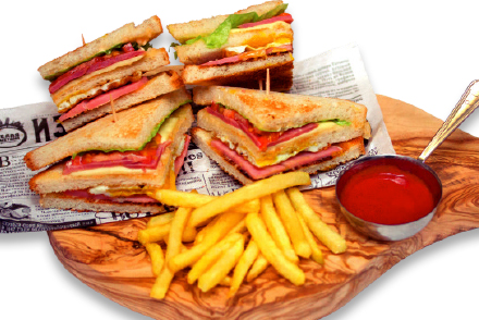 Ветчина индейки,грудка куриная, хлеб сэндвичный, сыр чеддер, картофель фри, салат листовой, кетчуп, майонез