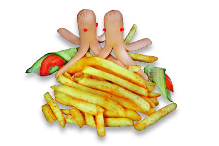 Сосиски, картофель фри, перец болгарский, огурец