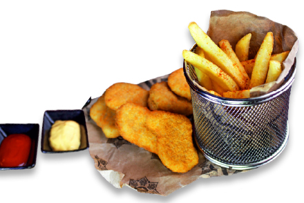 Наггетсы, картофель фри, сырный соус, кетчуп