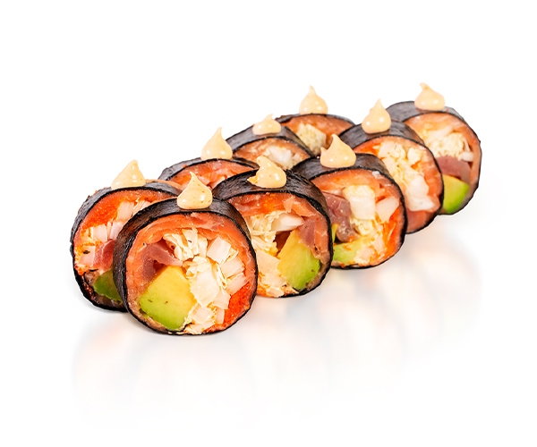 Лосось, тунец, авокадо, пекинская капуста, соус Спайси, икра тобико, водоросли нори. Энергетическая ценность: 530 ккал