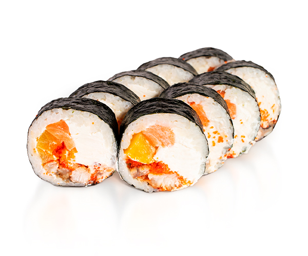Угорь копченый, лосось, икра тобико, сыр Филадельфия, такуан маринованный,. водоросли нори, рис. Энергетическая ценность: 848ккал