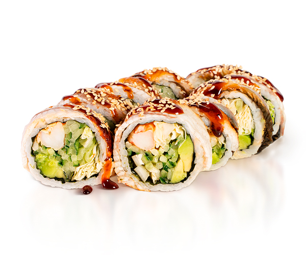 Креветка, авокадо, угорь копченый, кунжут, соус унаги, водоросли нори, рис, огурец, капуста пекинская, соус спайси. Энергетическая ценность: 650 ккал