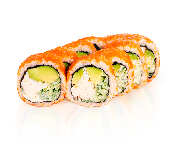 Краб снежный, икра тобико, авокадо, огурец, японский майонез, водоросли нори, рис. Энергетическая ценность: 653 ккал