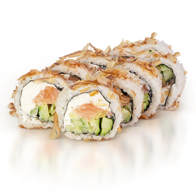 Лосось, стружка тунца, сыр Филадельфия, огурец водоросли нори, рис. Энергетическая ценность: 488 ккал