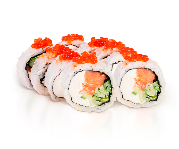 Лосось, икра лосося, сыр Филадельфия, водоросли нори, рис, огурец.Энергетическая ценность: 497 ккал
