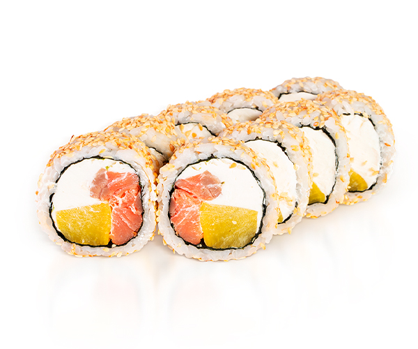 Лосось копченый, сыр Филадельфия, такуан маринованный, кунжут, водоросли нори, рис. Энергетическая ценность: 445 ккал