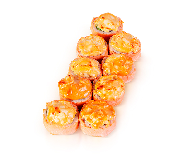 Лосось,снежный краб, сыр Филадельфия, соус терияки, майонез, такуан маринованный, водоросли нори, рис. Энергетическая ценность: 561 ккал