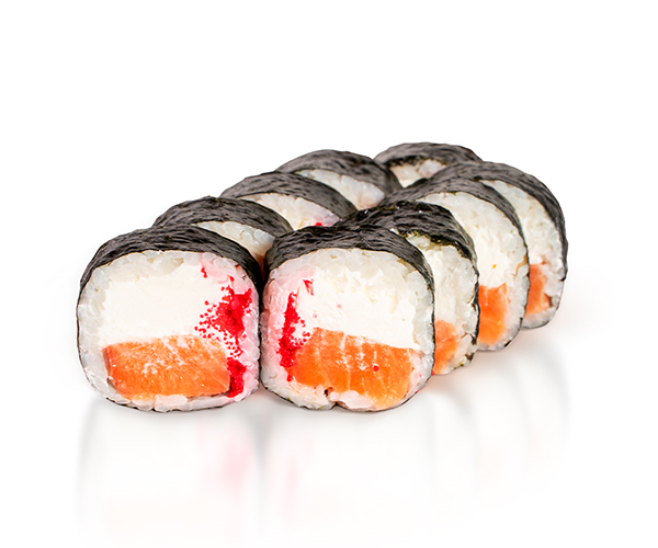 Лосось, сыр Филадельфия, икра тобико, водоросли нори, рис. Энергетическая ценность: 772 ккал