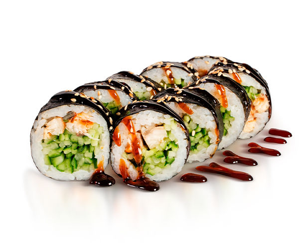 Угорь копченый, соус унаги, кунжут, водоросли нори, рис, огурец. Энергетическая ценность: 430 ккал