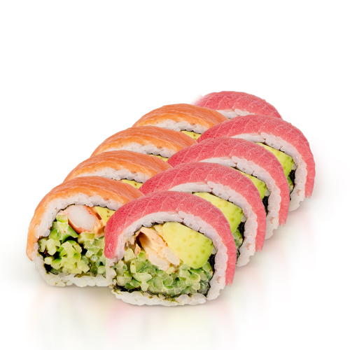 Лосось, тунец, креветка, огурец, авокадо, соус Спайси, водоросли нори, рис. Энергетическая ценность: 609 ккал