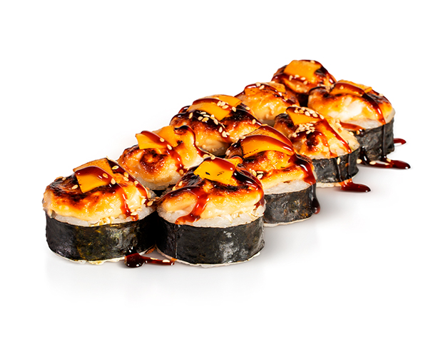 Угорь/лосось/креветка, сыр Филадельфия, водоросли нори, рис, майонез японский. Энергетическая ценность: 811 ккал