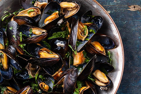 Мидии, чеснок, соус, лимон, мирин. Энергетическая ценность: 225 ккал
