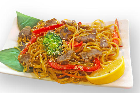 Яичная лапша, овощной микс,лук репчатый, морковь, перец болгарский, цукини, шампиньоны, кунжут, зелень и соевый соус