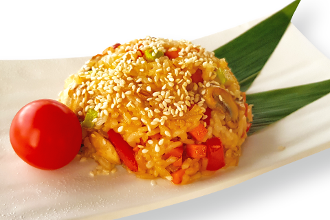 Белый рис, овощной микс,лук репчатый, морковь, перец болгарский, цукини, шампиньоны, кунжут, зелень и соевый соус