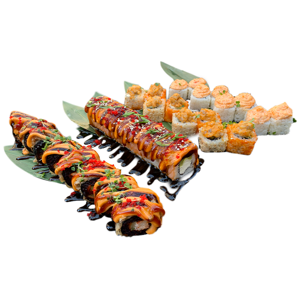 "Филадельфия спайси" c лососем и такуаном, соусами унаги и спайси, запечённый «Яма маки» с шапкой из копчёного лосося и соуса спайси с начинкой из сыра Филадельфия и такуаном, жареная "Калифорния темпура блэк" из черного риса, с крабом и огурцом, под соусом спайси и унаги и икрой тобико, "Фудзи маки" с лососем и сыром Филадельфия. Энергетическая ценность: 3533ккал