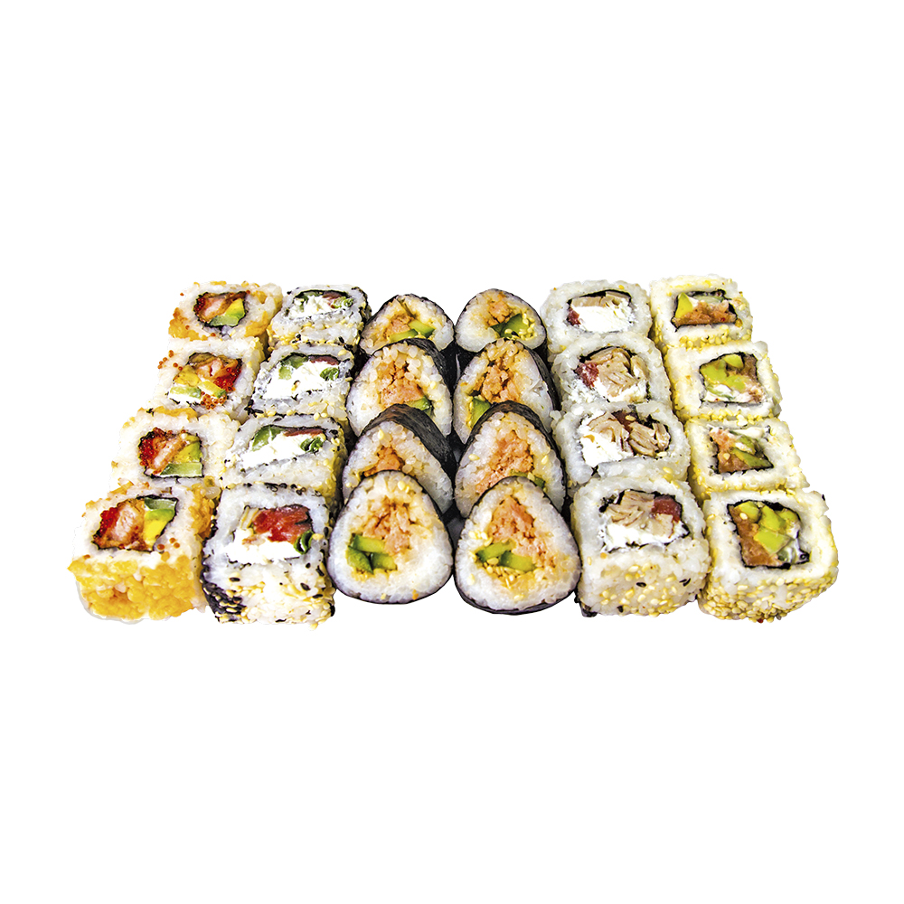 Небольшой сет из половинок фирменных роллов из лосося: "Ниппон" из лосося и огурца с соусом Унаги, , "Сяке Темпура Маки" с лососем, обжаренным в кляре , "Кавасаки" с копченым лососем и зеленым луком, "Традиционный" из лосося и авокадо с японским майонезом, "Тамаго Сяке маки" из копченого лосося и японского омлета. Энергетическая ценность: 1045ккал.