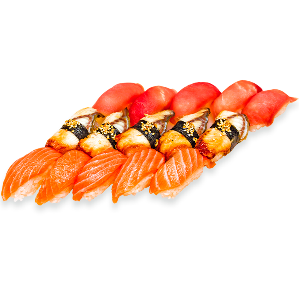 В составе набора классические суши: "Сяке" из лосося, "Унаги" из копченого угря, "Магуро" из тунца. Энергетическая ценность: 849ккал.