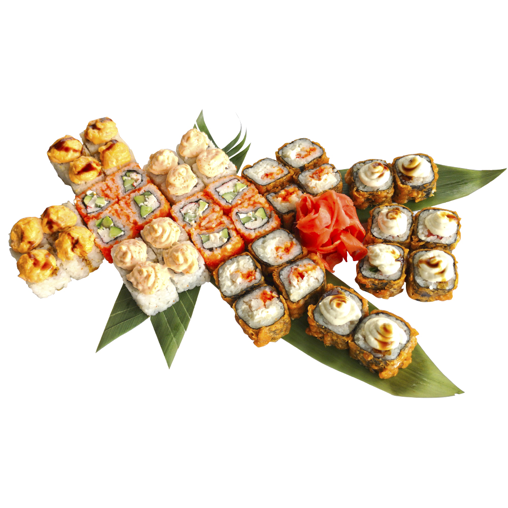 "Калифорния" с крабом и огурцом, запеченный "Унаги гриль" из сыра Филадельфия с огурцом под пикантной шапкой из сыра и соуса Кимчи, "Фудзи маки" с лососем, жаренный в кляре ролл "Ика темпура" с кальмаром и чесночным соусом, обжаренный в кляре ролл "Сакура" с крабом, икрой тобико и сыром Филадельфия, фирменный соус Юзу к жареным роллам. Энергетическая ценность: 3420ккал