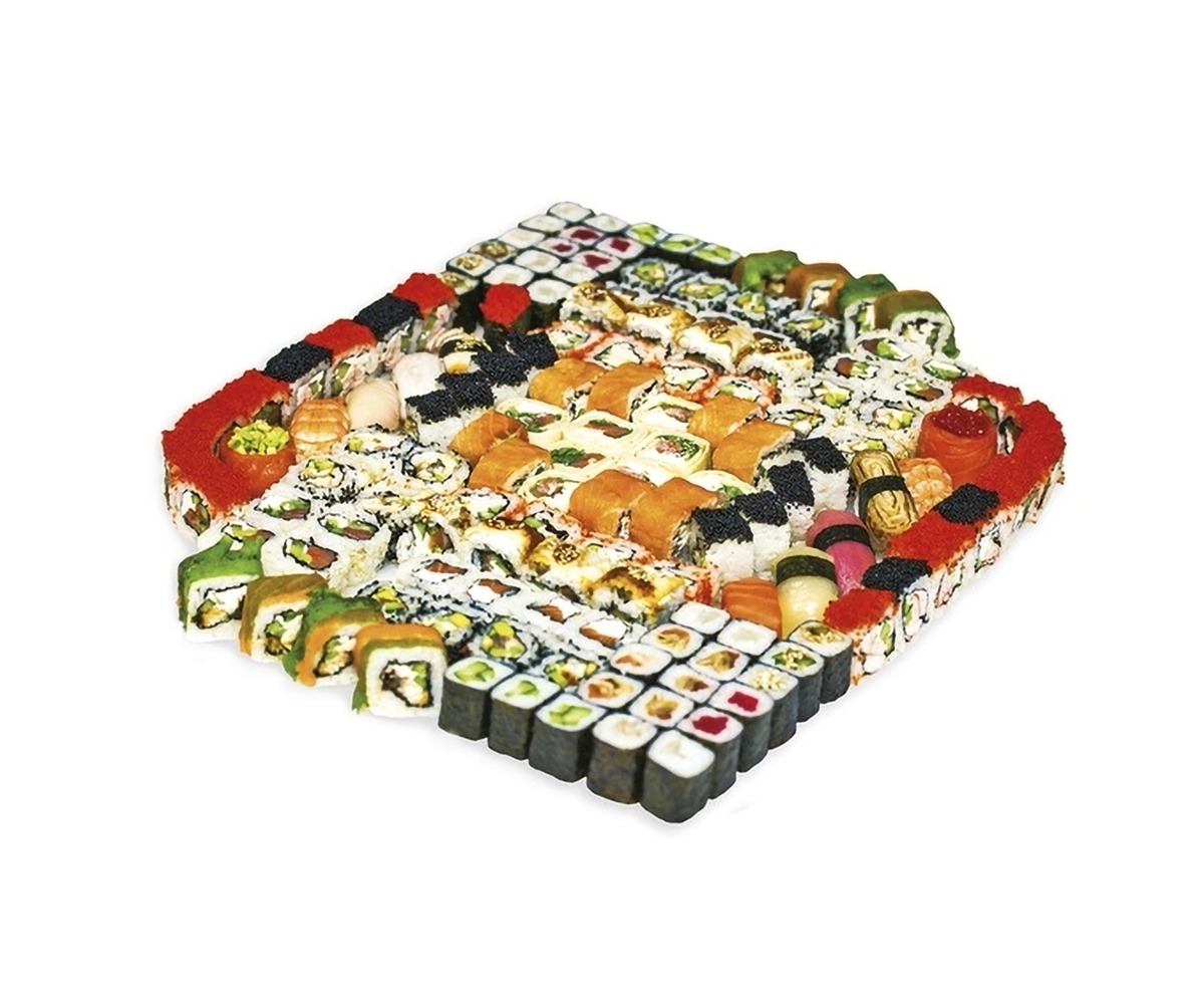 Суши (12 шт.): "Магуро" (тунец), "Сяке" (лосось) , "Унаги" (копченый угорь), "Тамаго Яки" (японский омлет), "Тако" (осьминог), "Эби"(креветка) (2 шт.), "Тай" (орской окунь), "Тобико" (икра тобико), "Икура Де Люкс" (лосось и икра лосося), "Авокадо Де Люкс" (лосось и авокадо), "Хамачи" (лакедра). Роллы "Самурай" с лососем и японским омлетом, овощной ролл с Фетаксой "Фетаки маки", "Кавасаки" с копченым лососем, "Зебра" креветкой и угрем, "Фудзи маки" с лососем под шапкой из соуса Фудзи, "Калифорния" с крабом, "Ямайка" с лососем и Фетаксой, "Шахматы" с тигровой креветкой, "Африка" с копченым угрем и Фетаки, "Канада" с угрем, традиционная "Филадельфия с лососем", фирменный ролл"Студия Суши" с копченым угрем и лососем, "Мехико" в мексиканской тортилье с копченым лососем, "Тэкка маки" с тунцом, "Тай маки" с окунем," Унаги маки" с угрем, "Каппа маки" с огурцом, "Хотатэ маки" с морским гребешком. Энергетическая ценность: 6671 ккал