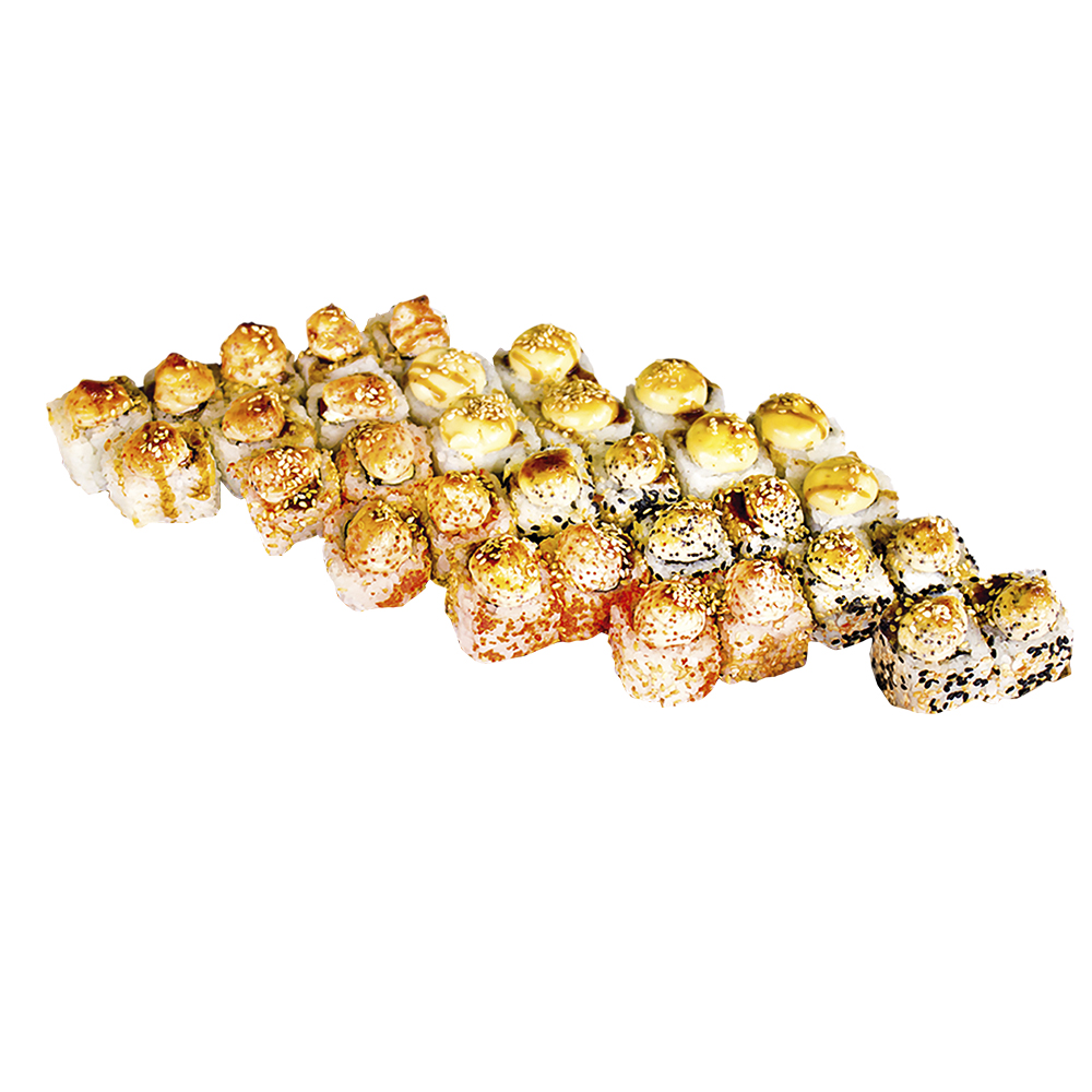 Набор из запеченных роллов. "Хонсю" с курицей, сыром Филадельфия и томатом, "Хоккайдо" с крабом и японским омлетом, "Кюсю" скрабом, сыром Филадельфия, японским омлетом, соусом Цезарь, "Сикоку" с креветкой, крабом, и японским майонезом. Все роллы покрываются соусом Унаги и кунжутом. Вес: 825г Энергетическая ценность: 2757ккал