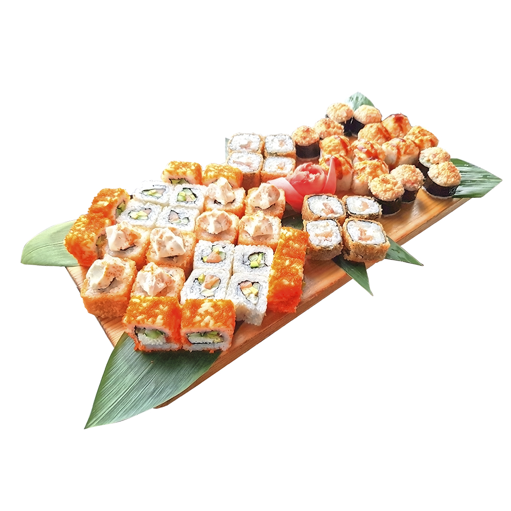 "Калифорния" с крабом и огурцом, жареная "Калифорния Де Люкс" с крабом и шапочкой из сыра Филадельфия и икры тобико, жареный ролл "Филадельфия темпура" в сухарях с лососем и сыром, запеченный "Унаги гриль" из сыра Филадельфия с огурцом под пикантной шапкой из сыра и соуса Кимчи ", запеченный "Вулкан" с крабом, пекинской капустой и соусом спайси, "Традиционный" ролл в кунжуте с лососем и авокадо. К жареным роллам фирменный соус Юзу. Энергетическая ценность: 3825ккал