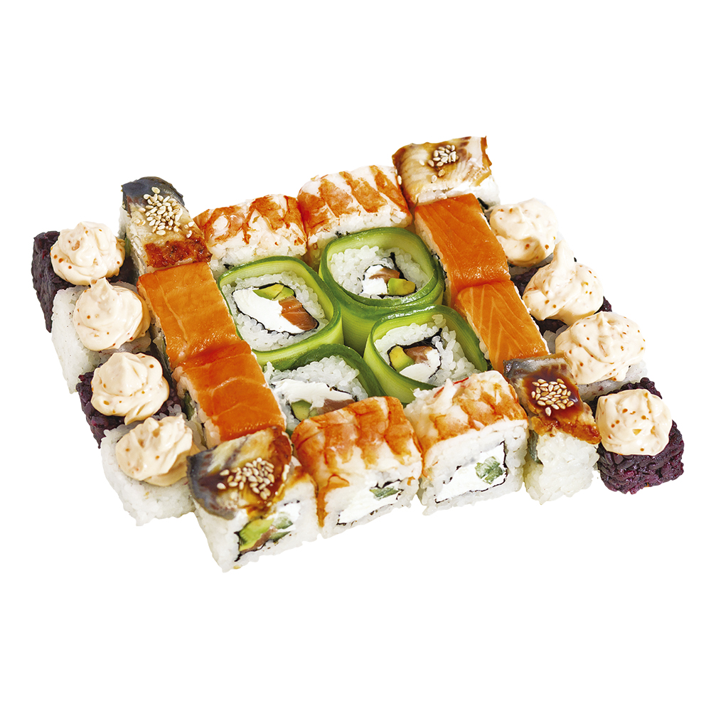 Набор из половинок самых популярных роллов. Обернутый огурцом ролл "Зеленый Дом" из лосося, авокадо и сыра Филадельфия, "Канада" из лосося, копчёного угря, огурца и авокадо, "Филадельфия" из лосося с огурцом, "Фудзи маки" из лосося с сыром Филадельфия под шапочкой из соуса Фудзи, "Фудзи маки Блэк" ролл из дикого риса с лососем, "Эби Филадельфия" с креветкой и огурцом. Энергетическая ценность: 1794ккал