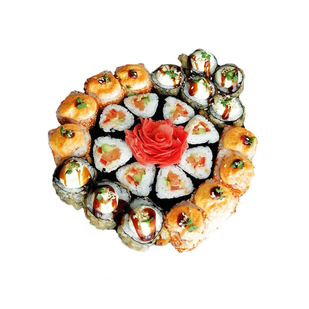 Запеченный ролл "Хоккайдо" с крабом и японским омлетом, жаренный в кляре "Ика темпура" с кальмаром и чесночным соусом, запеченный "Хоккайдо" с крабом и японским омлетом, фирменный ролл "Хоку" с лососем, авокадо, болгарским перцем и соусом Спайси. Соус Юзу для жареных роллов. Вес: 560г Энергетическая ценность: 2032ккал