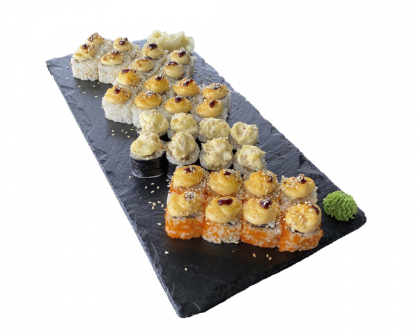 Запеченный сет из фирменных роллов. "Хокусан тори"с курицей и креветкой, "Хонсю" с курицей, томатом и сыром Филадельфия, "Кюсю", с крабом, японским омлетом и соусом Цезарь, "Сикоку" с крабом, креветкой и икрой тобико . Энергетическая ценность: 1939ккал.
