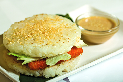 Котлета рыбная, салат айсберг, сыр Филадельфия, рис, укроп, кунжут белый, соус терияки, соус ореховый. Энергетическая ценность: 469 ккал