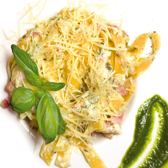 феттуччини,бекон, сливки, чечснок, каперсы, лук, яйцо куриное, пармезан Энергетическая ценность: 980 ккал