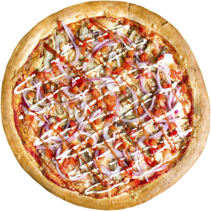 Шашлык, перец болгарский, лук маринованный , сыр Моцарелла, соус с дымком, соус Фреско, кетчуп.