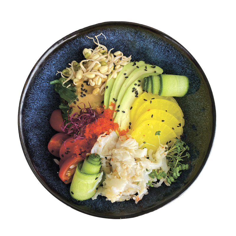 Снежный/натуральный краб, рис, авокадо, огурец, водоросли чука, ореховый соус, такуан, икра масаго, проростки Маш, кунжут черный
