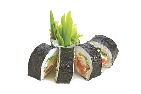 Лосось копчёный, лист салата, лук, сыр филадельфия, рис, нори. Энергетическая ценность: 243 ккал