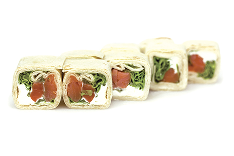 Лосось копчёный, сыр Филадельфия, лист салата, мексиканская лепешка тортилья. Энергетическая ценность: 328 ккал