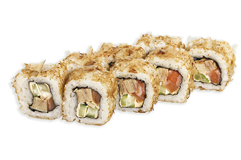 Лосось, японский омлет, огурец, стружка тунца бонито, соус спайси. Энергетическая ценность: 430 ккал