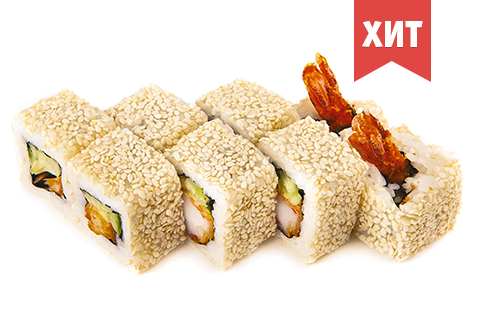 Креветка в кляре и темпурной муке, огурец, авокадо, кунжут, японский майонез. Энергетическая ценность: 492 ккал
