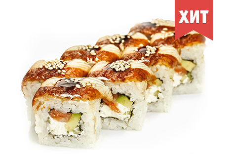 Лосось, копчёный угорь, огурец, авокадо, сыр Филадельфия, кунжут, соус унаги. Энергетическая ценность: 451 ккал