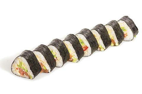 Лосось, авокадо, болгарский перец, рис, нори, соус спайси. Энергетическая ценность: 392 ккал