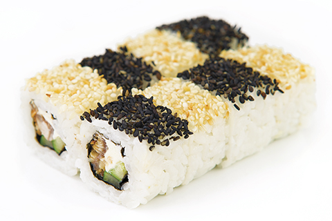 Угорь, японский омлет, огурец, сыр Филадельфия, кунжут. Энергетическая ценность: 391 ккал