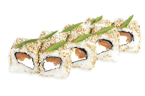 Копчёный лосось, сыр Филадельфия, лук зелёный, кунжут белый. Энергетическая ценность: 322 ккал