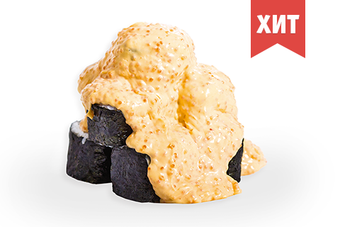 Лосось, угорь, авокадо, соус «Вулкан» (японский майонез, икра тобико, соус табаско). Энергетическая ценность: 976 ккал