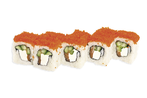 Лосось, икра тобико, сыр Фетаки, огурец. Энергетическая ценность: 429 ккал