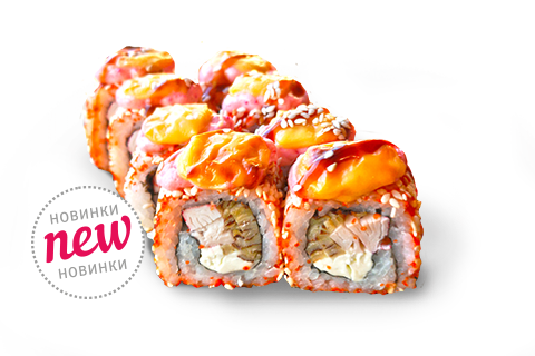 сыр Филадельфия, омлет японский, сыр чеддер, масаго, кунжут, соус унаги