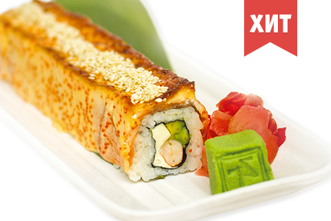 Лосось, креветка, сыр Фетаки, авокадо, тобико, кунжут, японский майонез. Энергетическая ценность: 693 ккал