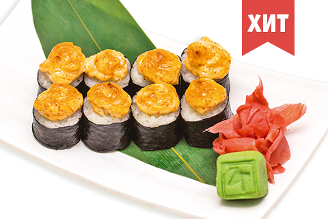 Лосось, сыр Филадельфия, морской гребешок, икра тобико, японский майонез. Энергетическая ценность: 492 ккал