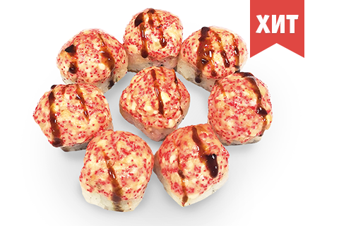Окунь, сливочный сыр, огурец, соус унаги с шапочкой из сыра, майонеза и кимчи с икрой масаго,