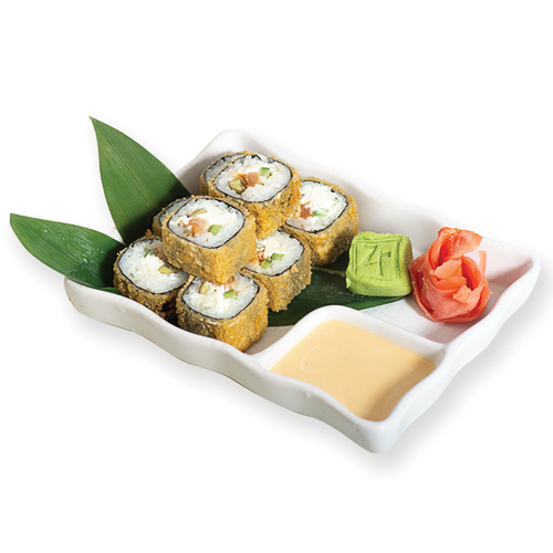 Лосось, угорь, авокадо, огурец, сыр Филадельфия, сухари, кляр, темпурная мука, соус юзу. Энергетическая ценность: 568 ккал