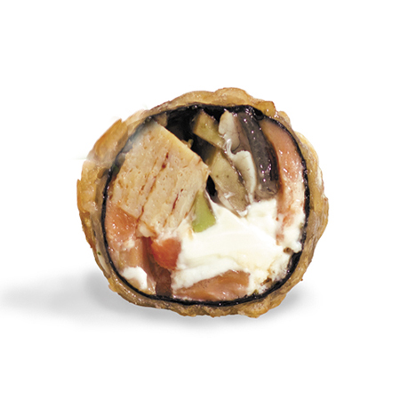 Угорь, японский омлет, авокадо, сыр Филадельфия, кляр, соус юзу (ролл без риса). Энергетическая ценность: 444 ккал