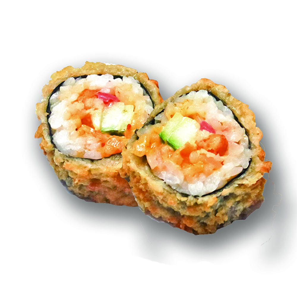 Лосось обжаренный в кляре, огурец, имбирь, сухари панировочные, соус кимчи, соус спайси